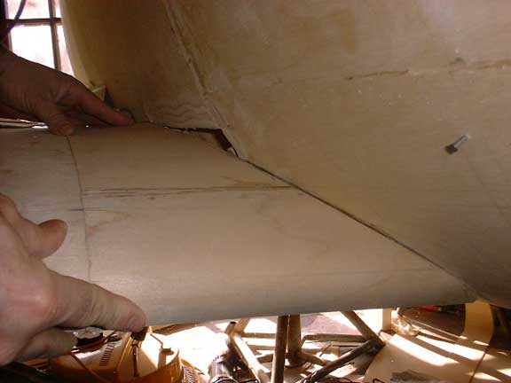 These are the gluing strips just below the main wing spar. The purpose of these strip is to provide a gluing surface to the plywood that will cover the lower part of the airplane. |