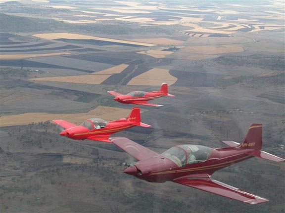 Unfortunately the Harvard wasn't included in this flight, so the resulting photographs are of only three Falcos, with Juliet in with Ian in the lead plane. Wayne's experience showed through when he told us that, as one reference for power changes, he was using the on and off flicker of the gear warning light in Drew's plane ahead of him.