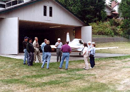September was the date, Seattle was the place. In typical NW fashion the weather was forecast for rain and wind. The Falcos started arriving about 10:00 Thursday morning. Per Burholm was first with a long-time friend, who had grown up in the local area. Larry and Ann Black were close behind. John and Pat Harns came in the early afternoon. Jack Lange and pilot friends/support crew arrived in a nice Bonanza A36. We shoehorned the three Falcos into our hangar, and our Falco went into the neighbor's. Our old Bonanza and the A36 had to sit out in the weather, but the wood airplanes were protected.
