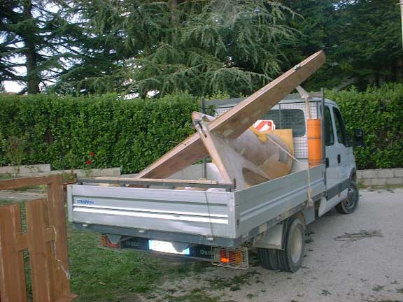 The moment has arrived. After all we thought that painting the tail at home wasn't exactly a good idea, not only for the powder and the bad smell. We got in touch with a professional painter and coachbuilder, Mr. Domeniconi, and we agreed to move the tail to his workshop, since he could perform the painting job in his spraybooth. So the tail is leaving on the truck that Mr. Cari sent us. |