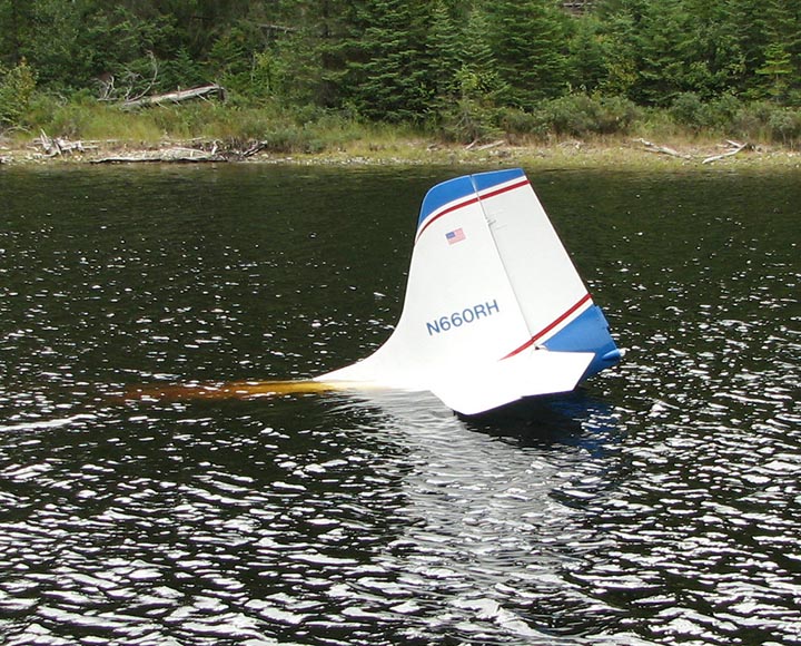 Simon describes hitting a tree on the way down, and they found a one-meter-long section of tree embedded partway through the right side of the horizontal stabilizer and significant damage to the right wing from the tree. Most of the fairings and almost the entire belly were ripped from the plane, presumably by the water during the landing.