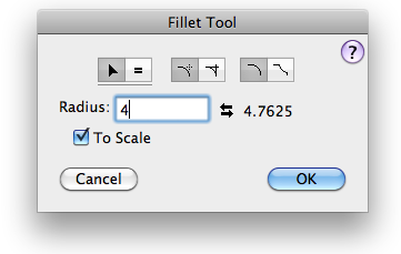 In the tool's dialog, choose whether the fillet will be interactive (arrow) or to a fixed dimension (equal sign). Choose if you want trimming at the fillet. This only applies to lines. Choose whether you want an inside or outside fillet. This determines which way the arc will be placed. Type the radius-the standard PowerCADD math functions and mixed dimensional units may be used. This radius is known as the 'active radius'. Like many other tools, the Fillet tool has an on-deck setting for the radius. You can exchange this value with the active radius by clicking on the left-right arrow icon or on the on-deck text. If the To Scale option is selected, the fillet will be to the drawing scale, if not, the radius will be an on-paper size.