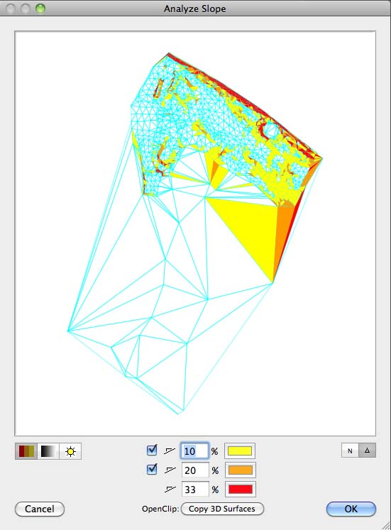 How It Works OpenClip works ‘behind the scenes’ and requires no action on the part of the user. Whenever you choose Cut or Copy, OpenClip will place the drawing objects on the clipboard in the OpenClip format. Other programs that have their own OpenClip plug-ins can then Paste into their program. OpenClip also works on Paste but requires that other programs put objects on the pasteboard (same as 'clipboard') along with several others that PowerCADD puts there. In addition, it also writes a file out to the path /Library/Application Support/OpenClip/OpenClip which we will call the OpenClip path. This allows you to see that something has happened, and to look at the file with the OpenClip Viewer app if you're really interested in knowing more about this. A normal Cut or Copy places 2D objects on the pasteboard. You can press the Option key while selecting Cut or Copy and OpenClip will do a place 3D objects on the pasteboard. This means that objects with a Z height created by TopoTools or Paolo Rossi’s Topography Tools will be copied as 3D objects and can be pasted as 3D objects in a 3D program. In addition, in TopoTools, the dialogs for Analyze Topo/Find Contours and Analyze Topo/Analyze Slope have options to copy 3D surfaces and topo contours as 3D objects which can be pasted into a 3D program. For example, in TopoTools and Analyze Topo/Analyze Slope, you can go from this...
