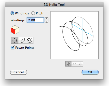 In the tool's dialog, choose to define the helical spiral by windings or pitch. Type the number of windings or the pitch for the helical spiral. Pitch is the length per winding. Click on a side of the cube control to change the current view plane. Select the type of spiral: circular, logarithmic or arithmetic. See the Spiral tool for an explanation. Select Fewer Points if you want excess points to be removed from the polygon placed. This sort of filtering is automatic with the Spiral tool, but it's optional here since it can create some rough places in the spiral loops. (You may want to try Simplify to remove excess points.) Select in-plane if you want to place or draw the helical spiral directly in the current view plane. Alternatively, you may select one of the two out-of-plane choices, in which case the helical spiral is rotated about the 'horizontal' or 'vertical' axis of the current view plane.