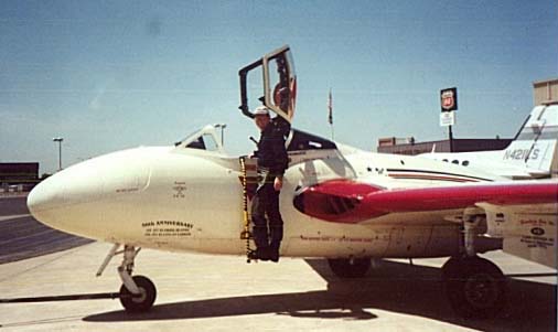 One day another 421-owner friend of mine called me. He said "the 421 is a great limo, but we need something FUN." It turns out he was thinking of a Christen Eagle, or Extra 300 or something. In an effort to defuse this fantasy, I offered my opinion. "Nah, forget those things. For that kind of money you want to get a jet fighter." Mark was not a warbird guy, but his "wow meter" was pegged. "Yeah, you want an ex-Swiss Airforce two-seat de Havilland Vampire." And I sent him on his way. I thought he'd superficially look into it and turn his interests elsewhere.