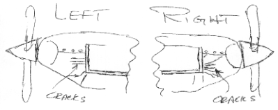 Following a trip to the west coast Falco fly-in, Cecil sent us the sketch above. He said the cracks are surface cracks, apparently in the paint and possibly gel coat of the cowling only. Our suspicion is that the cowling mod described in the article above may have created additional stiffness in the cowling and caused loads to be concentrated in these areas and this may have created the cracking (which we have not seen in other Falcos).