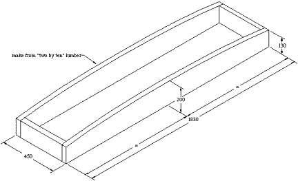The lamination was then sanded to 16mm thick. To sand the lamination, Jerry used a "sanding skid", nothing more than a sanding board or Disston Abrader mounted to 16mm thick pieces of wood, which raised the sanding board off the table the required amount. Jerry's sanding skid looks like an extra-wide snow sleigh, with sandpaper wrapped on the bottom side of the "seat". The skids were attached with countersunk nails up from the bottom, through the sandpaper and into the "seat".